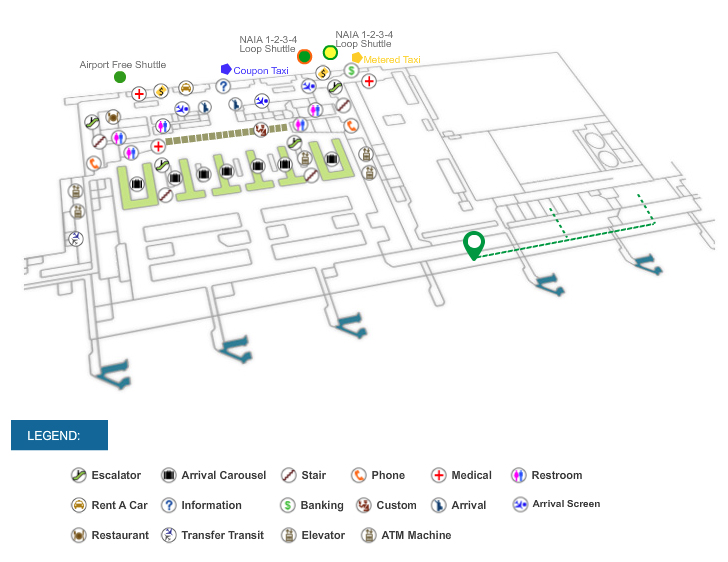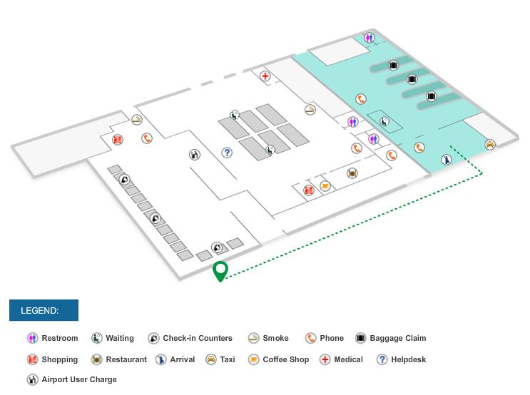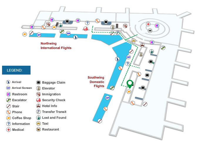 After collecting your luggage, pass through customs and walk out of the doors. Before reaching the arrivals area (ramp going down), turn right on the street and walk to the end.
